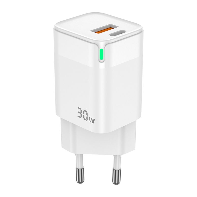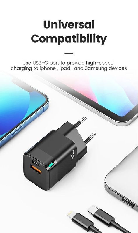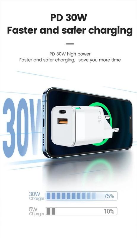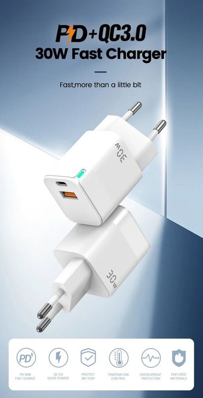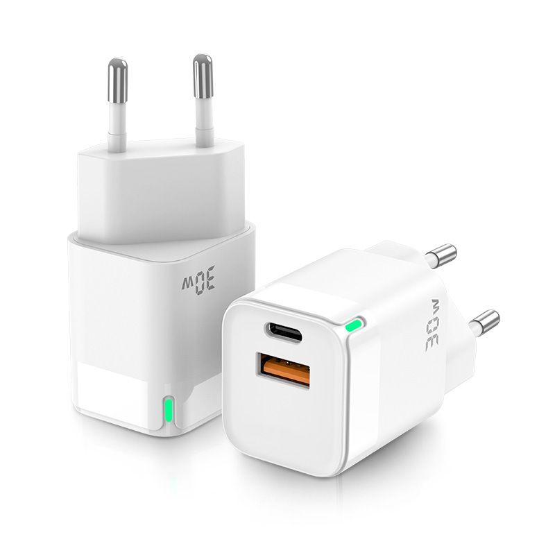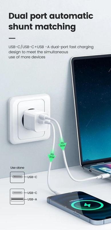 NUVIO oferuje dwa porty – USB-A i USB-C – umożliwiając jednoczesne ładowanie kilku urządzeń. Dzięki technologii GaN ładowarka zachowuje miniaturowy rozmiar przy dużej mocy, idealny do torby lub kieszeni. Obsługa PD30W i QC3.0 zapewnia szybkie i bezpieczne uzupełnianie energii w smartfonach i innych akcesoriach.
